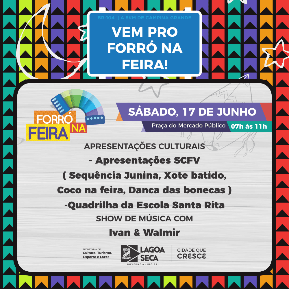 A Prefeitura de Lagoa Seca, através da Secretaria de Cultura, Turismo, Esporte e Lazer, realiza neste sábado (17) mais uma edição do Forró na Feira. O evento gratuito acontece a partir das 7h e segue até 11h na Praça do Mercado Público.