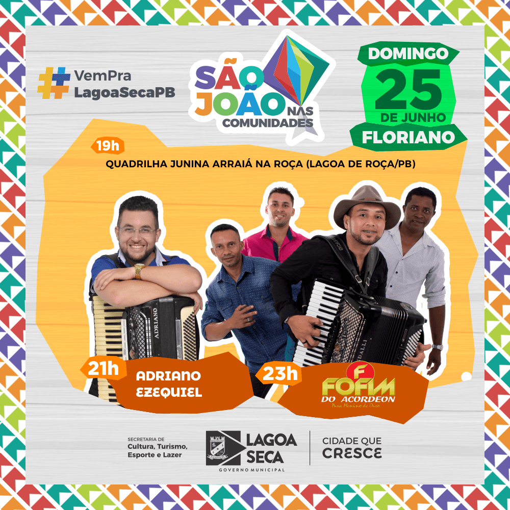 Prefeitura de Lagoa Seca promove neste domingo (25) a partir das 17h, mais uma ação do São João nas Comunidades. Os eventos gratuitos para população, seguem um cronograma e contemplam diversas comunidades localizadas na zona rural do município. A primeira ação foi no Alvinho no último sábado (17), e neste domingo será a vez da comunidade do Floriano. A festa vai começar às 17h com apresentações de quadrilhas juninas. Há 5 anos não havia nenhum tipo de comemoração junina promovida pelo Poder Público Municipal.