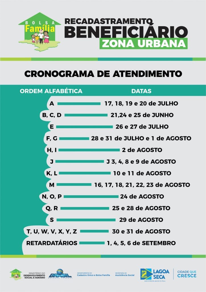 Após atender a toda zona rural, a partir da próxima segunda-feira (17) a Prefeitura de Lagoa Seca, através da Secretária Municipal de Assistência Social, inicia o processo de recadastramento dos usuários dos programas sociais oferecidos pelo poder público, que moram especificamente na zona urbana do município. Os trabalhos serão coordenados pelo Departamento de Cadastro Único e Programa Bolsa Família, que elaborou um calendário de atendimento para evitar transtornos durante todo o processo. Todo o atendimento será realizado no salão anexo da Câmara Municipal.