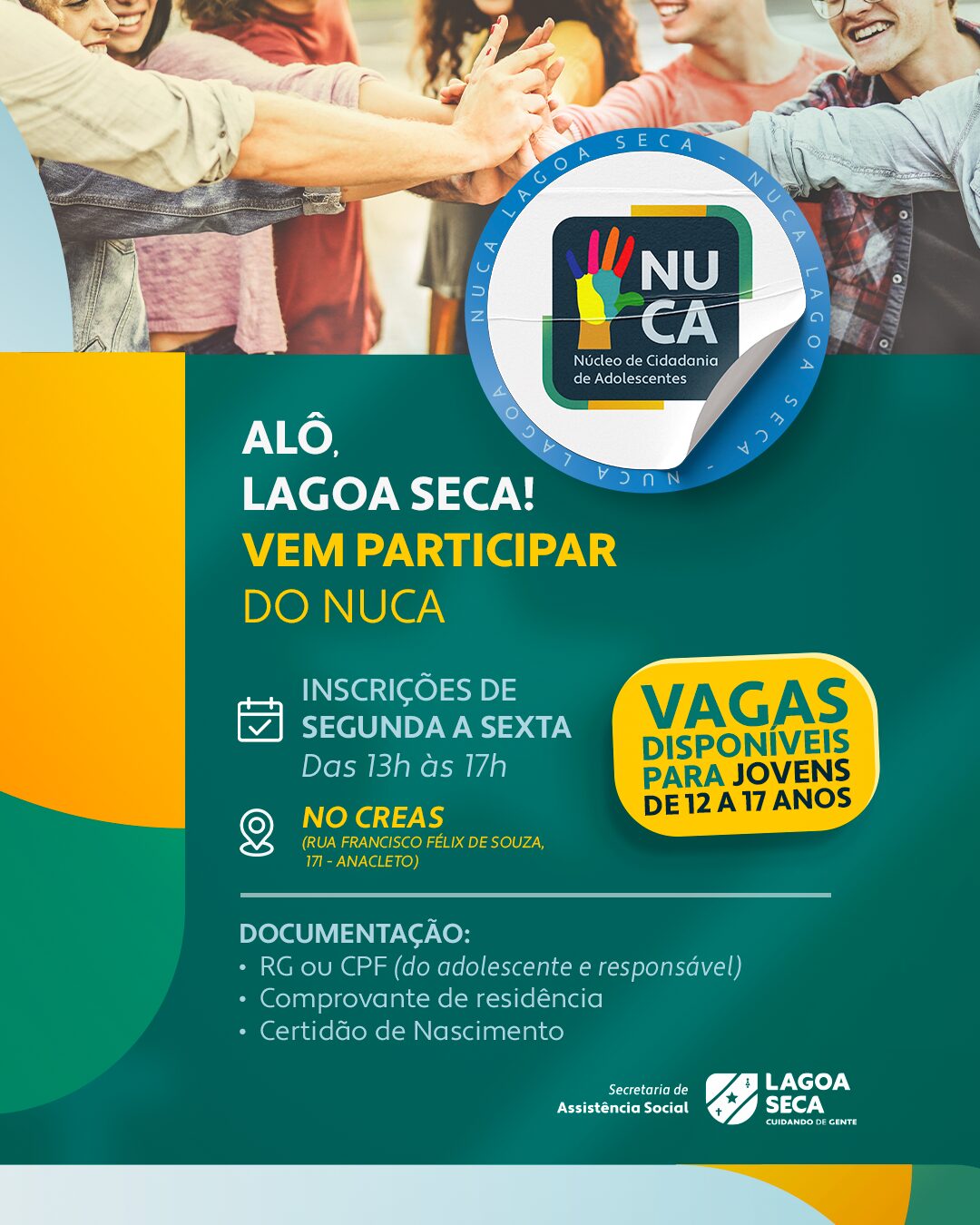 O Núcleo de Cidadania dos Adolescentes está com vagas abertas para jovens de 12 a 17 anos que morem em Lagoa Seca e queiram participar do programa. As inscrições estão acontecendo no Centro de Referência Especializado de Assistência Social (CREAS), de segunda a sexta-feira, das 13h às 17h. O setor está localizado na Rua Francisco Félix da Silva 171, bairro Anacleto (próximo a secretaria de Saúde).