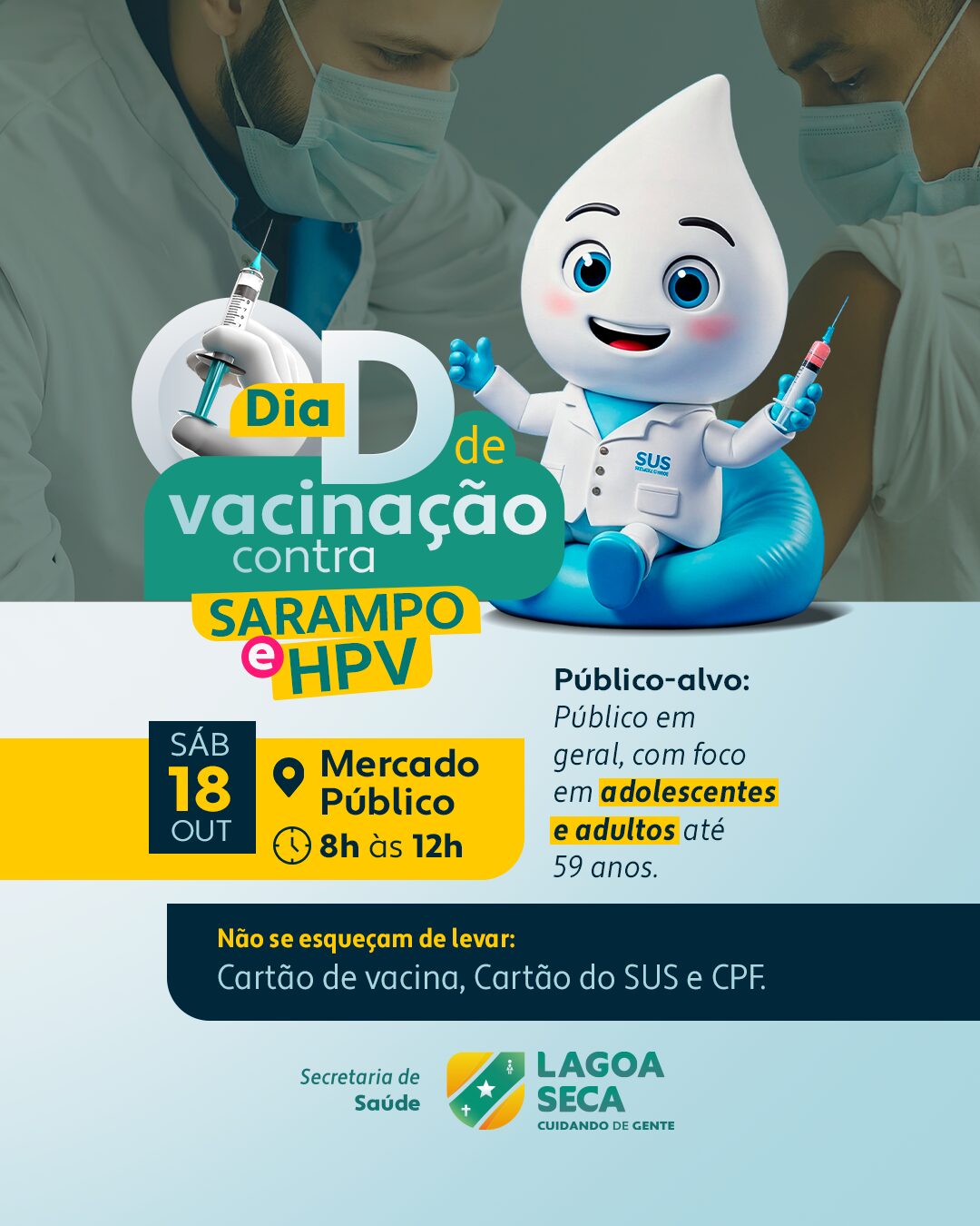 A Prefeitura de Lagoa Seca, por meio da Secretaria de Saúde, realiza neste sábado (18) o Dia D de Vacinação contra o Sarampo e o HPV. A ação acontece no Mercado Público, das 8h às 12h, e tem como objetivo ampliar a cobertura vacinal no município e reforçar a proteção da população.