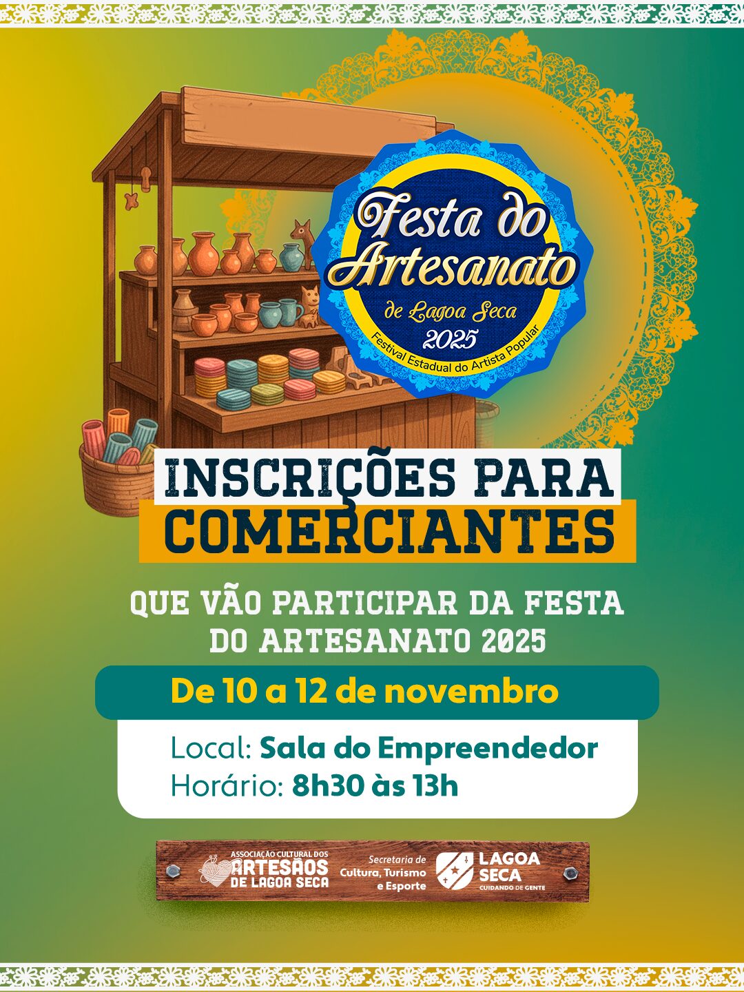 A Prefeitura de Lagoa Seca, por meio da Secretaria de Cultura, Turismo e Esporte, informa que estão abertas as inscrições para os comerciantes que desejam comercializar seus produtos durante a Festa do Artesanato 2025, que será realizada de 2 a 7 de dezembro.