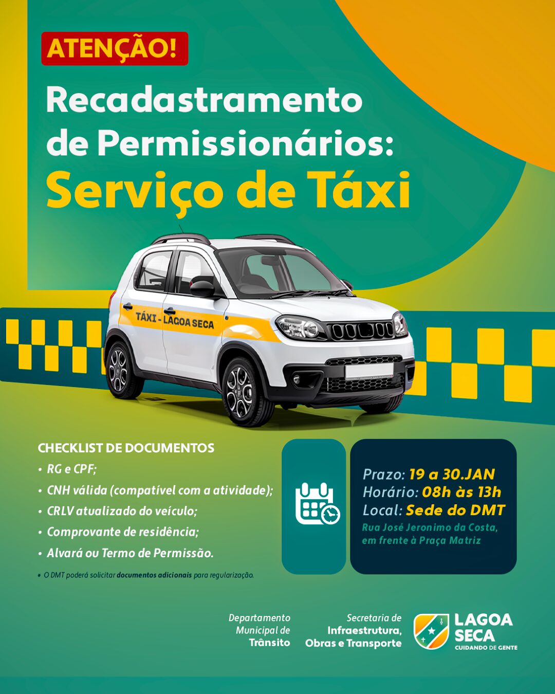 A Prefeitura de Lagoa Seca, por meio do Departamento Municipal de Trânsito (DMT), deu início ao recadastramento dos permissionários do serviço de táxi no município. A ação tem como objetivo atualizar os dados cadastrais e garantir a regularização do serviço prestado à população.