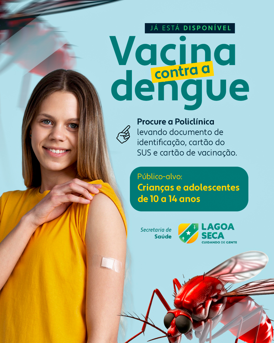 A Prefeitura de Lagoa Seca, por meio da Secretaria Municipal de Saúde, informa que a vacina contra a dengue já está disponível no município. O público-alvo da vacinação é formado por crianças e adolescentes com idade entre 10 e 14 anos, conforme definição do Ministério da Saúde.