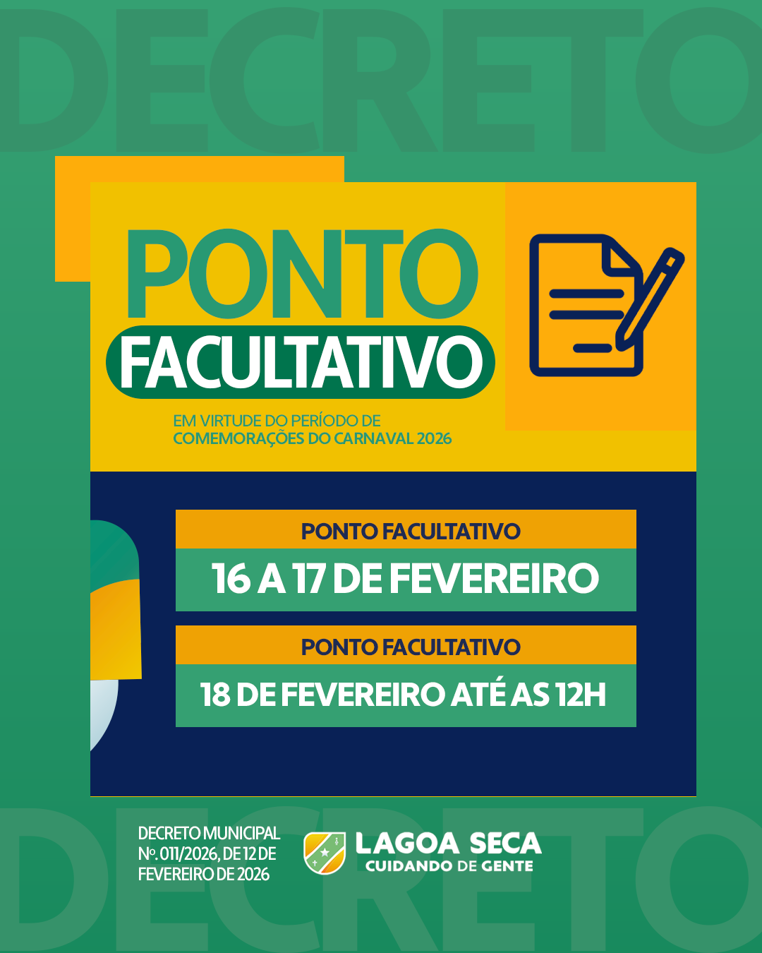 A Prefeitura de Lagoa Seca publicou o Decreto nº 011/2026, de 12 de fevereiro de 2026, que estabelece ponto facultativo nas repartições públicas municipais em virtude das comemorações do Carnaval 2026.