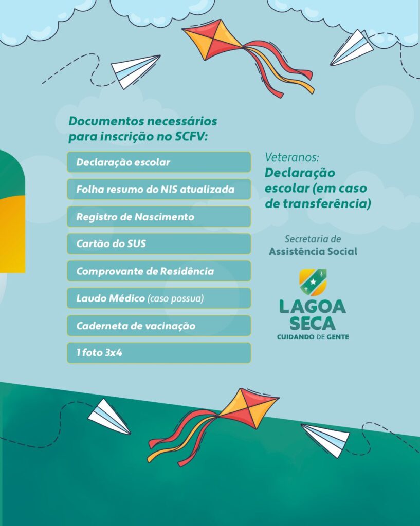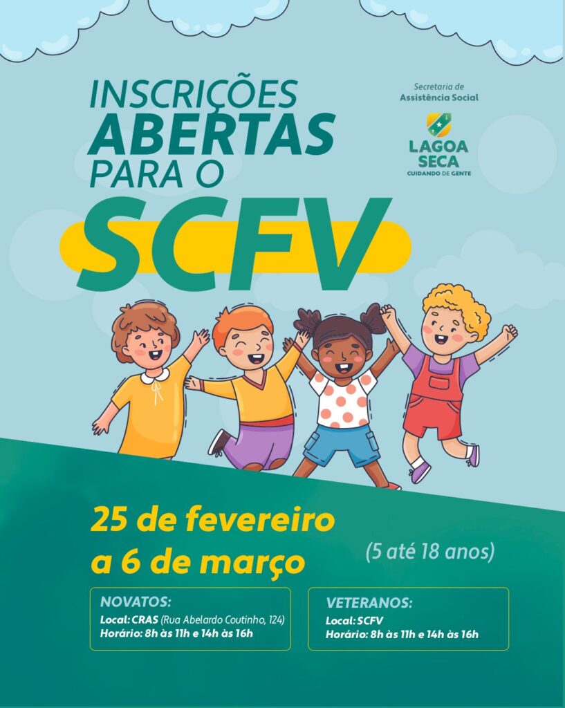 O Serviço de Convivência e Fortalecimento de Vínculos (SCFV) de Lagoa Seca estará realizando, no período de 25 de fevereiro a 6 de março, matrículas para veteranos e novatos que possuam idade entre 5 a 18 anos de idade.