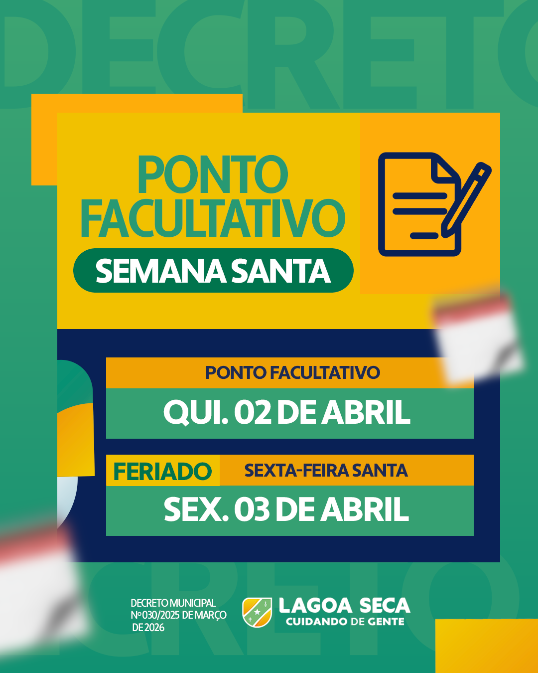 A Prefeitura de Lagoa Seca publicou o Decreto nº 030/2026, que estabelece ponto facultativo nas repartições públicas municipais nos dias 02 e 03 de abril, em virtude das celebrações da