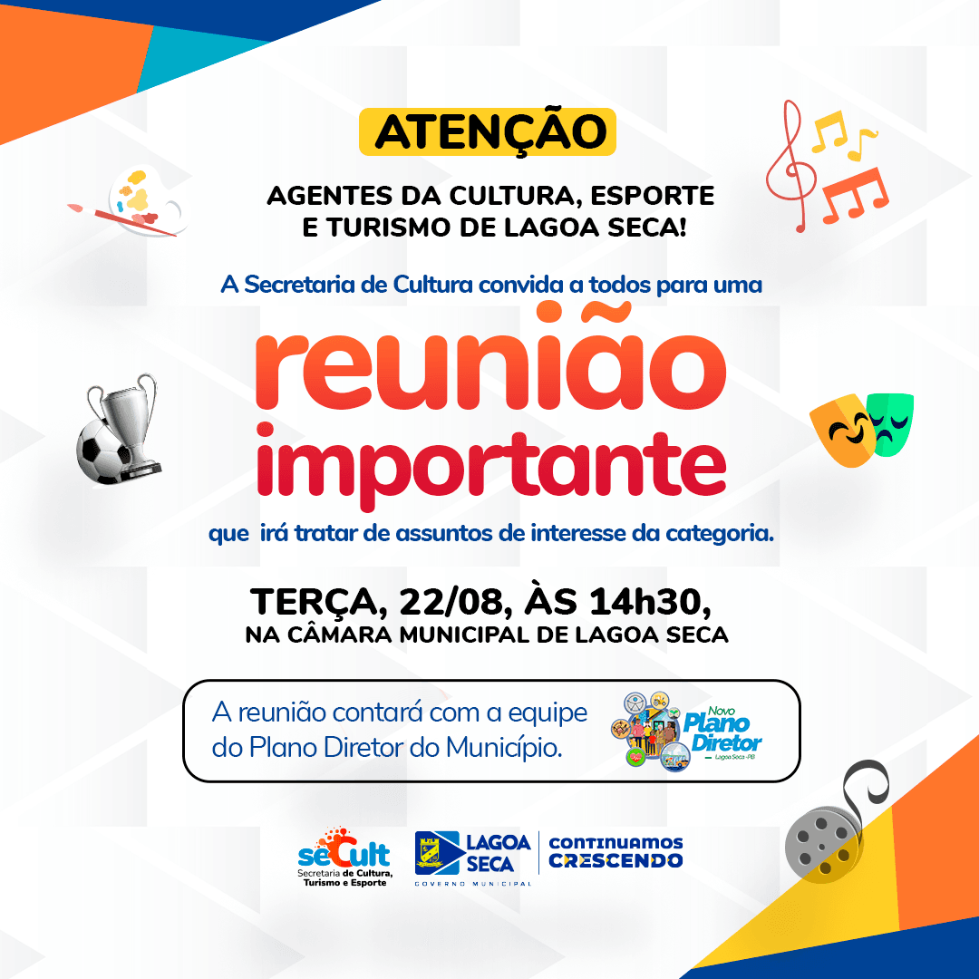 Dando continuidade aos trabalhos de revisão do Plano Diretor de Lagoa Seca, a Comissão de Planejamento e Gerenciamento promove reunião importante para ouvir agentes das áreas de cultura, turismo e