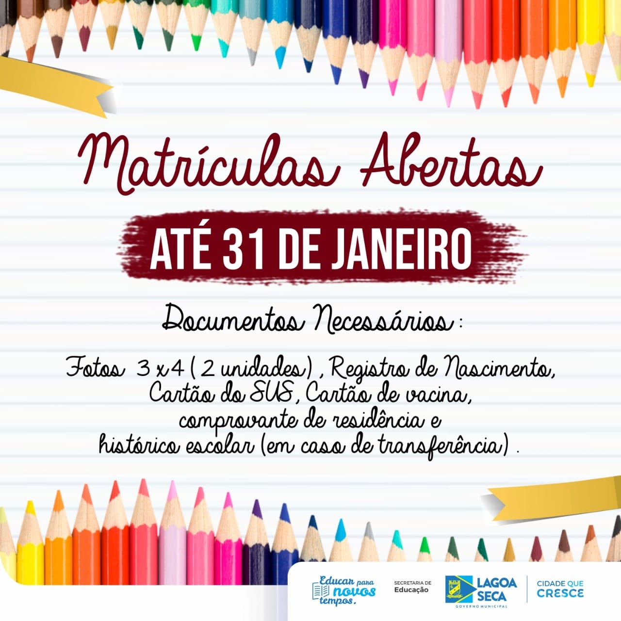 A Secretaria de Educação informa que as matrículas de alunos para a rede municipal de Lagoa Seca seguem até o dia 31 deste mês. As vagas estão distribuídas nas 29