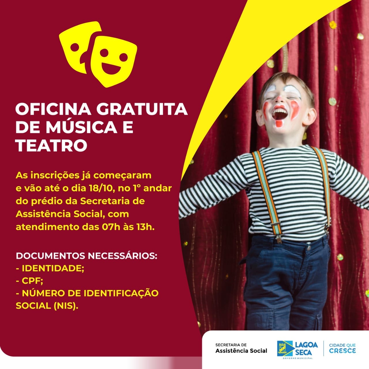 Estão abertas as inscrições para as oficinas gratuitas de Música e Teatro, em Lagoa Seca. Os interessados terão até o próximo dia 18 deste mês para realizarem a matrícula. Estão