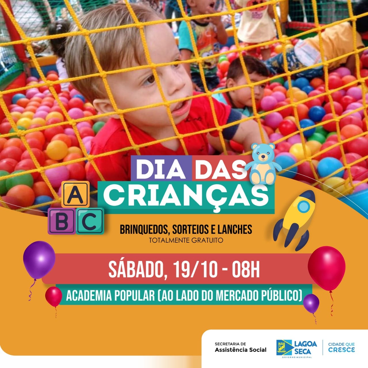 A Prefeitura de Lagoa Seca, através da Secretaria de Assistência Social, realiza no próximo dia 19, sábado, a festa das crianças. O evento acontecerá dessa vez na praça do Mercado